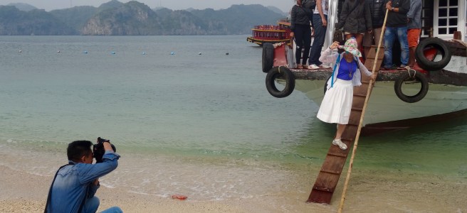 Het is dus even schrikken als de ‘vader’ van ons guesthouse vertelt dat er op dit moment geen individuele cruises mogelijk zijn in Halong Bay, maar alleen groepstours. Het zweet breekt me uit. Als je een paar honderd kilometer reist om dit Werelderfgoed te bewonderen, dan doe je dat niet vanaf de kade. Maar een groepstour…